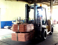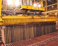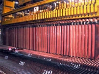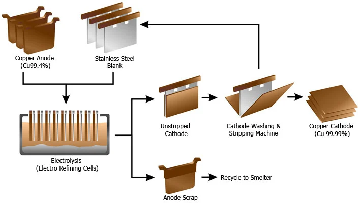 Copper anodes and SS blanks are inserted in electro refining cells. By applying direct current to this cell, copper in anode is dissolved and deposited onto the SS-blank surface. Cu % in cathode is more than 99.99%. By products at Refinery are anode slime and copper telluride.